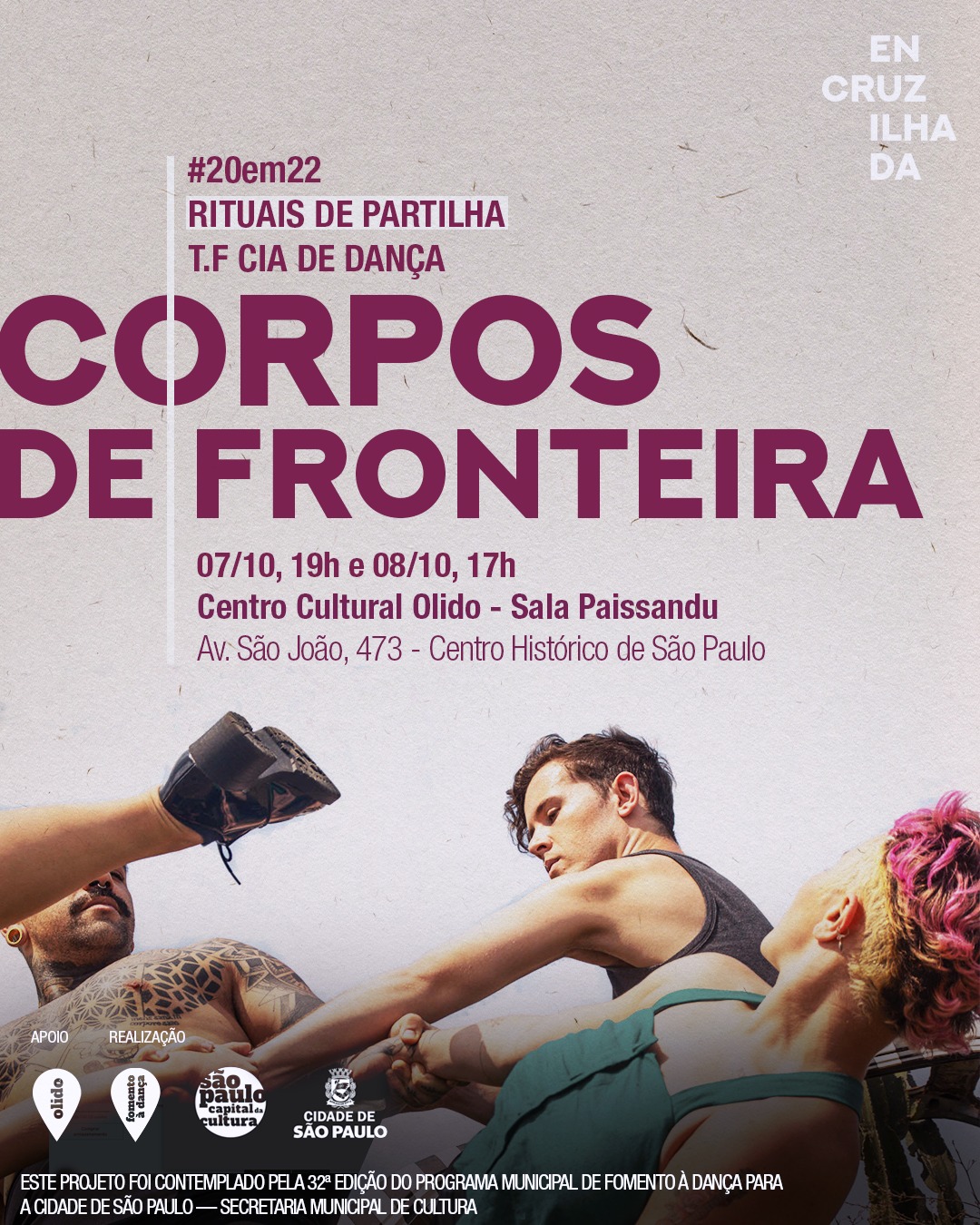Projeto #20em22 Rituais de Partilha - Fomento à Dança 2023 Corpos de Fronteira 07 e 08 de outubro de 2023 Sábado, às 19h | Domingo, às 17h Sala Paissandú - Galeria Olido | São Paulo/SP Grátis.