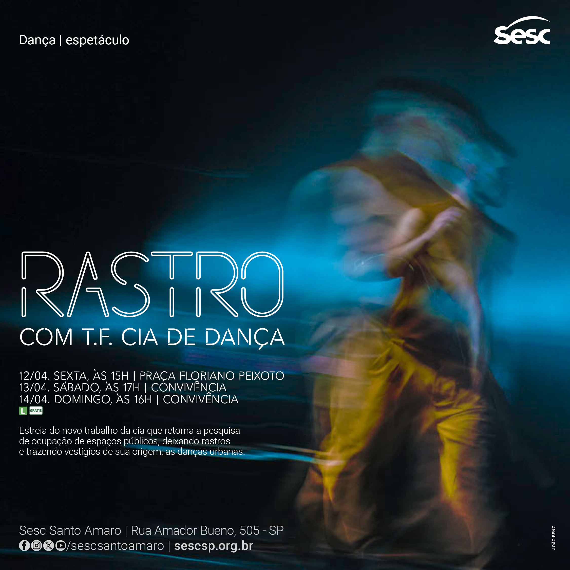 R A S T R O Estreia da obra Rastro no SESC Santo Amaro Dias 12, 13 e 14 de abril 12 de abril, 15h - Praça Floriano Peixoto 13 de abril, 17h - SESC Santo Amaro 14 de abril, 16h - SESC Santo Amaro Sinopse Fragmentos de tempo em espiral. Um
