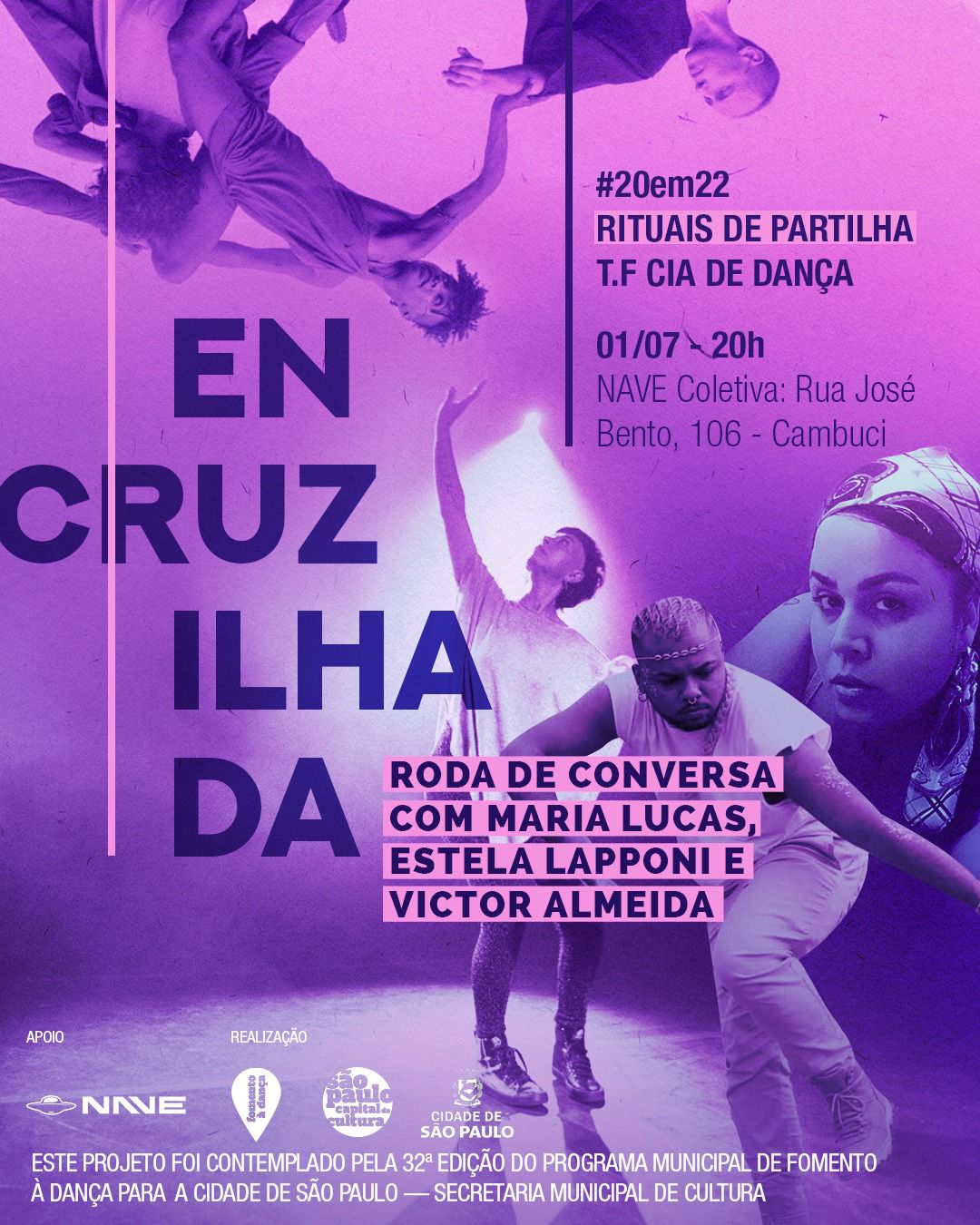 Projeto #20em22 Rituais de Partilha - Fomento à Dança 2023 Aulas Abertas: 30 de junho de 2023, 13h às 15h - Estela Lapponi 03 de julho de 2023, 18h às 20h - Maria Lucas 07 de julho de 2023, 13h às 15h - Victor Almeida Local: Sede da T.F. Cia de Dança Rua Síria, 180 - Tatuapé Roda