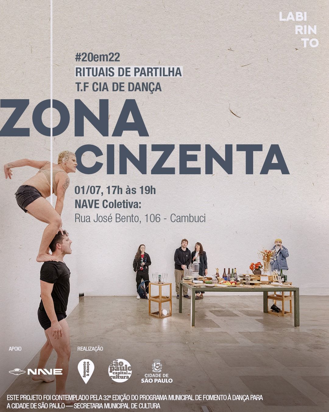 Projeto #20em22 Rituais de Partilha - Fomento à Dança 2023 Zona Cinzenta 01 de julho de 2023, 17h às 19h NAVE Coletiva Grátis.