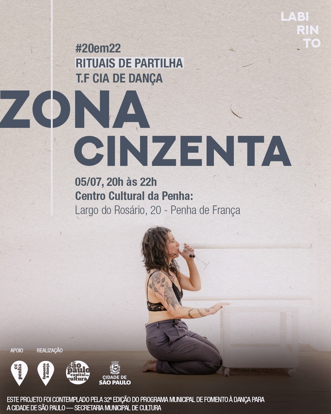 Centro Cultural da Penha Largo do Rosário, 20, São PauloProjeto #20em22 Rituais de Partilha - Fomento à Dança 2023 Zona Cinzenta 05 de julho de 2023, 20h às 22h Centro Cultural da Penha Grátis.